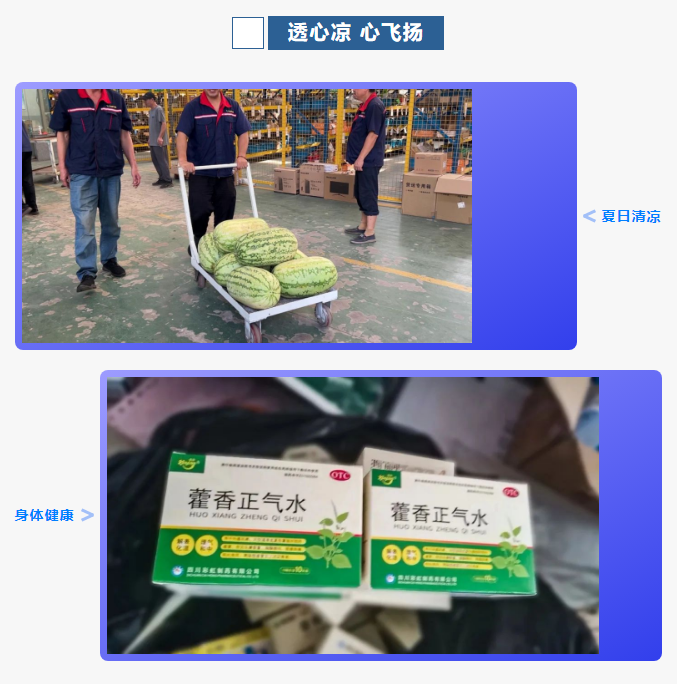 公司領(lǐng)導(dǎo)高度重視防暑降溫工作,切實(shí)保障生產(chǎn)安全,以實(shí)際行動(dòng)落實(shí)企業(yè)關(guān)懷,降溫風(fēng)扇、藿香正氣水、綠豆湯、西瓜等防暑降溫物資每日準(zhǔn)時(shí)為生產(chǎn)一線的員工送來(lái)絲絲的清涼。一份清涼,一份關(guān)懷,華豫萬(wàn)通以實(shí)際行動(dòng)向奮斗在一線的員工們致敬!